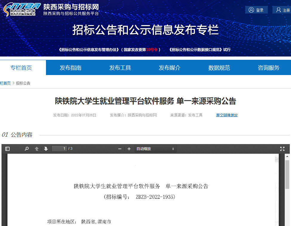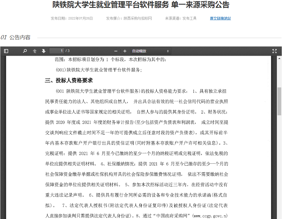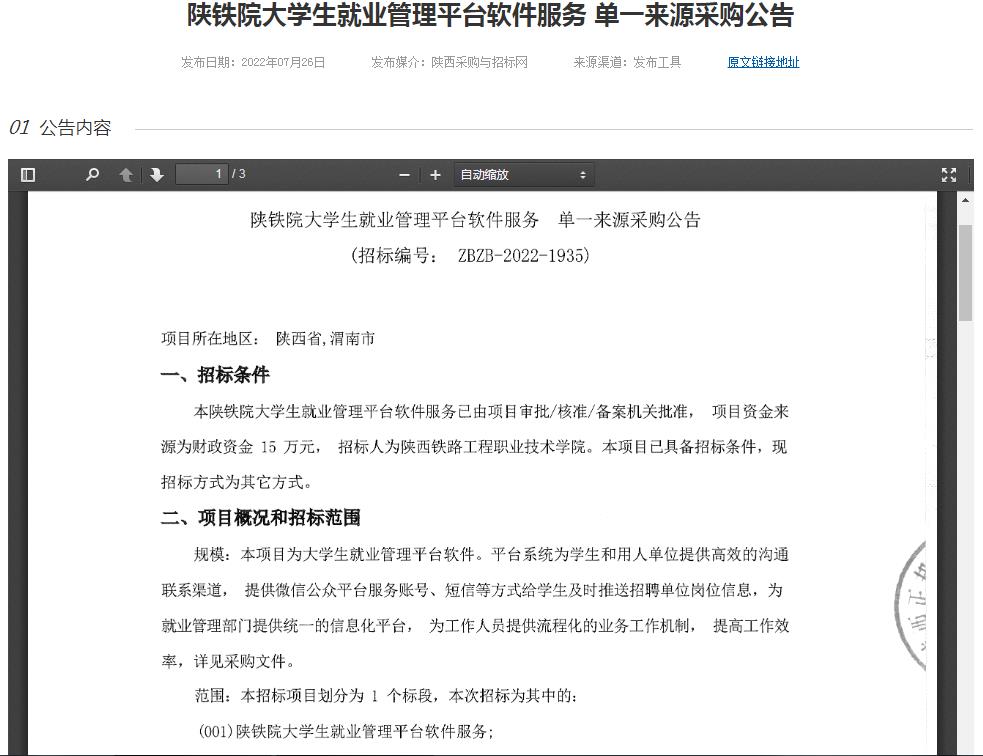 陜鐵院大學(xué)生就業(yè)管理平臺(tái)軟件服務(wù) 單一來源采購(gòu)公告